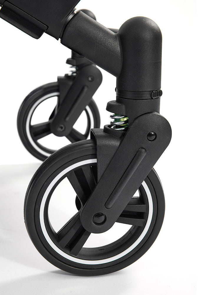 Our stroller is equipped with silent, high-durability PU wheels that ensure a peaceful ride, even on rough terrain. Each wheel features dual bearings for enhanced horizontal stability and smoother motion, further supported by eight rolling axles and four steering axles. You’ll experience more agile handling, making every stroll a breeze.