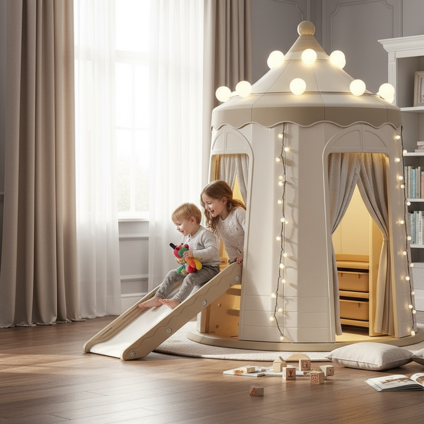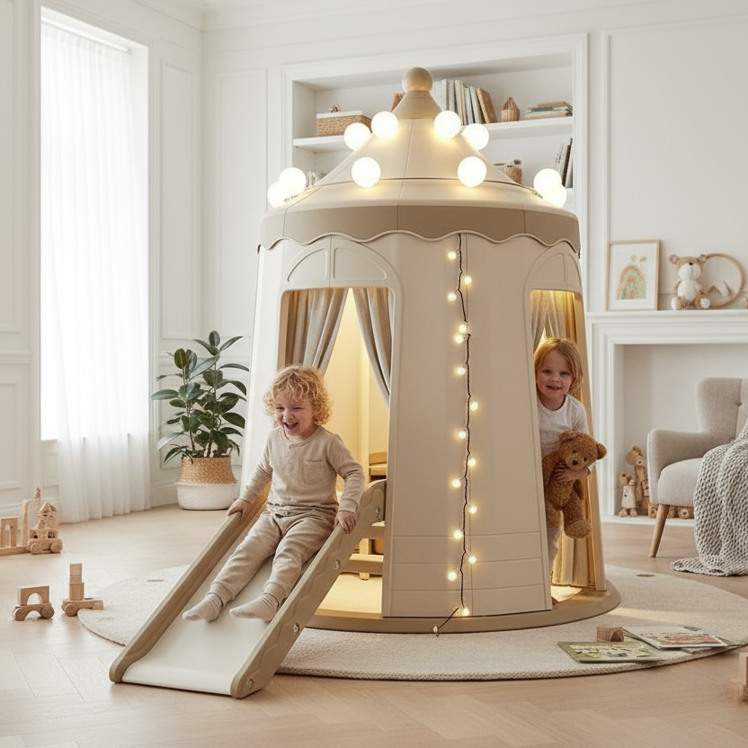 Our unique Castle Playhouse offers a secure and private mini-universe where children can let their imaginations run wild. They can enjoy a carefree childhood filled with freedom and creativity. The foldable slide seamlessly transforms the playhouse into a compact castle, offering flexibility for custom space arrangements.