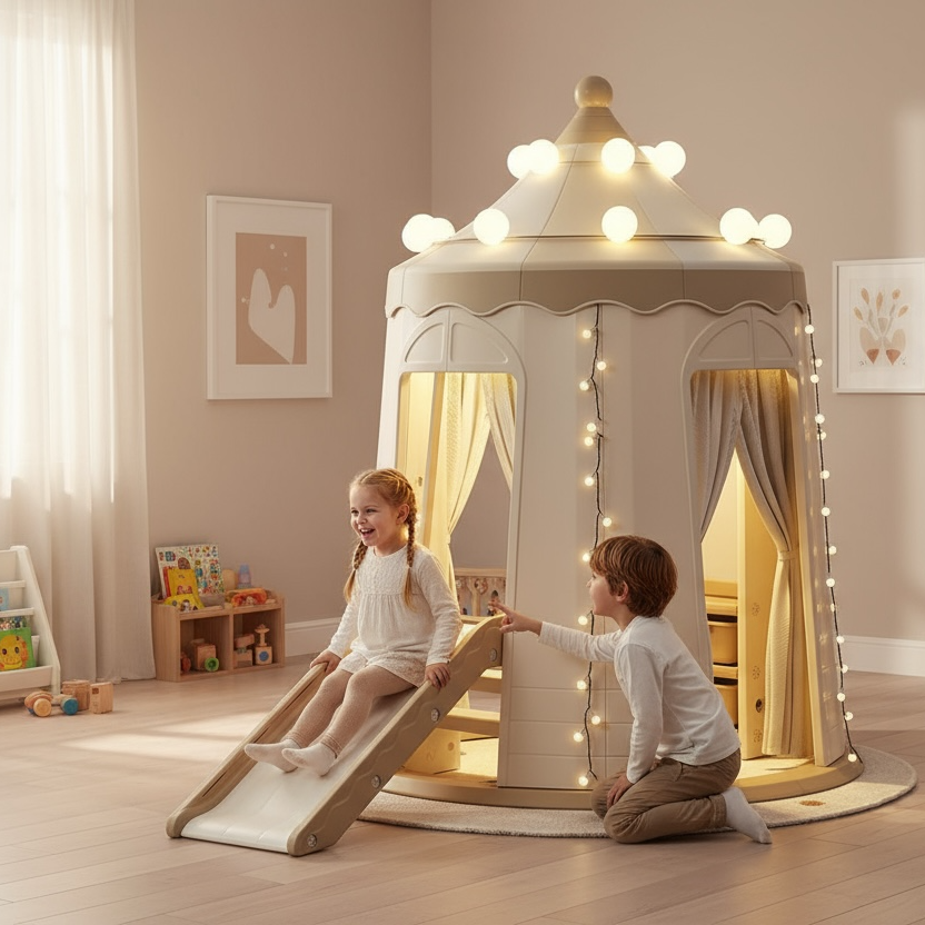 The integrated interior and exterior LEDs are thoughtfully designed to enhance every play scenario, whether your child is enjoying a quiet reading nook or transforming the space into a lively play palace. The exterior lighting sets the perfect ambiance for outdoor adventures, while the interior LEDs provide clear and gentle illumination for safe and comfortable play. The lighting's warm tones create a cozy atmosphere, fostering a sense of security and nurturing your child's imagination and spirit.