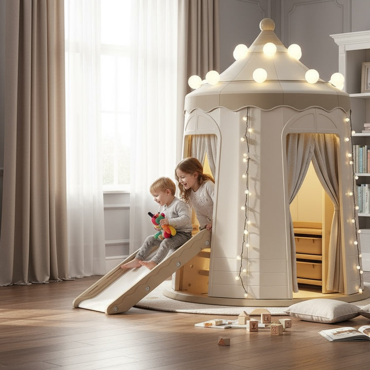 Introducing HappyGira Castle Playhouse - a magical retreat where your child can explore their imagination and passions in a private, secure space. Perfect for solo play or shared adventures with friends, this playhouse features a foldable slide that transforms it into a compact castle, offering flexibility and endless fun.