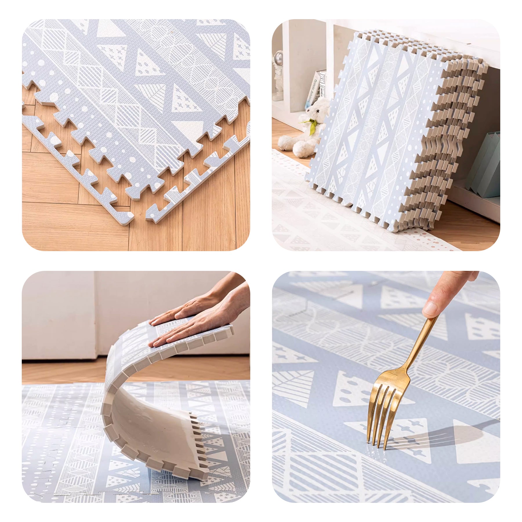For children who are still learning to crawl and walk steadily, maintaining a clean and flexible floor is essential. While many patterned floor mats on the market are solely designed for kids, parents looking to establish their home's decor style need something more versatile. Our beautifully patterned floor mat features balanced colors and exquisite designs that not only provide traditional water-resistant softness but also create a harmonious and aesthetically pleasing look when fully assembled. This ensures that families with new members can create a playful haven for their children without compromising the overall harmony and beauty of their home decor.