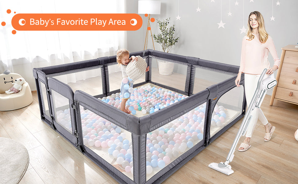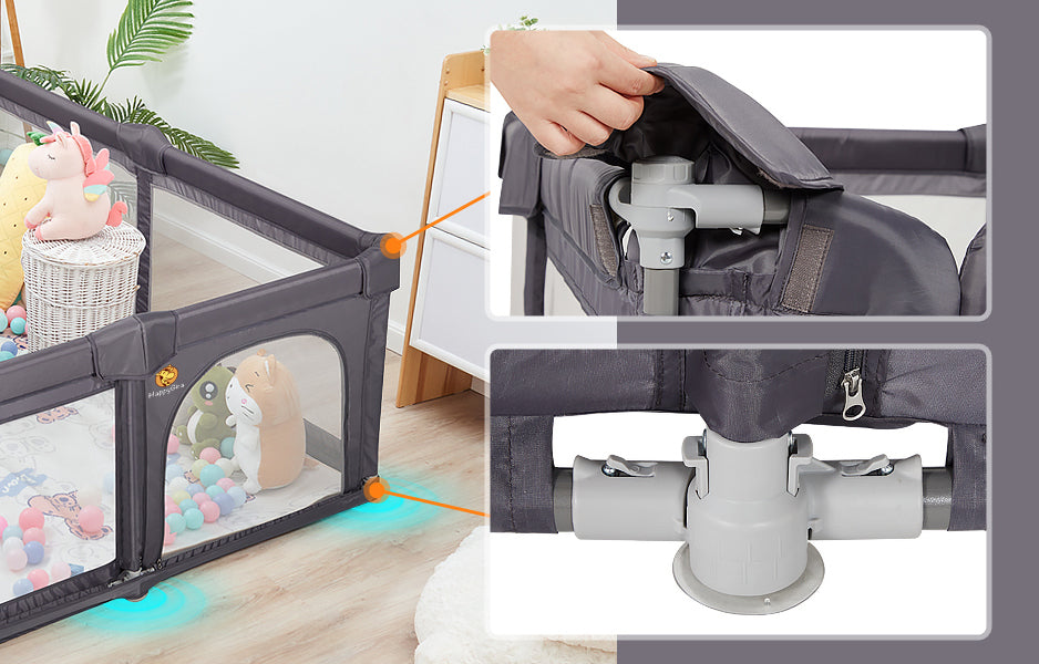 Dual-layer Oxford fabric, internal cotton lining, and steel pipes provide optimal cushioning, effectively protecting your active baby from bumps. The playpen is constructed with high-quality PP materials, featuring a stable suction cup base with a 1" diameter.