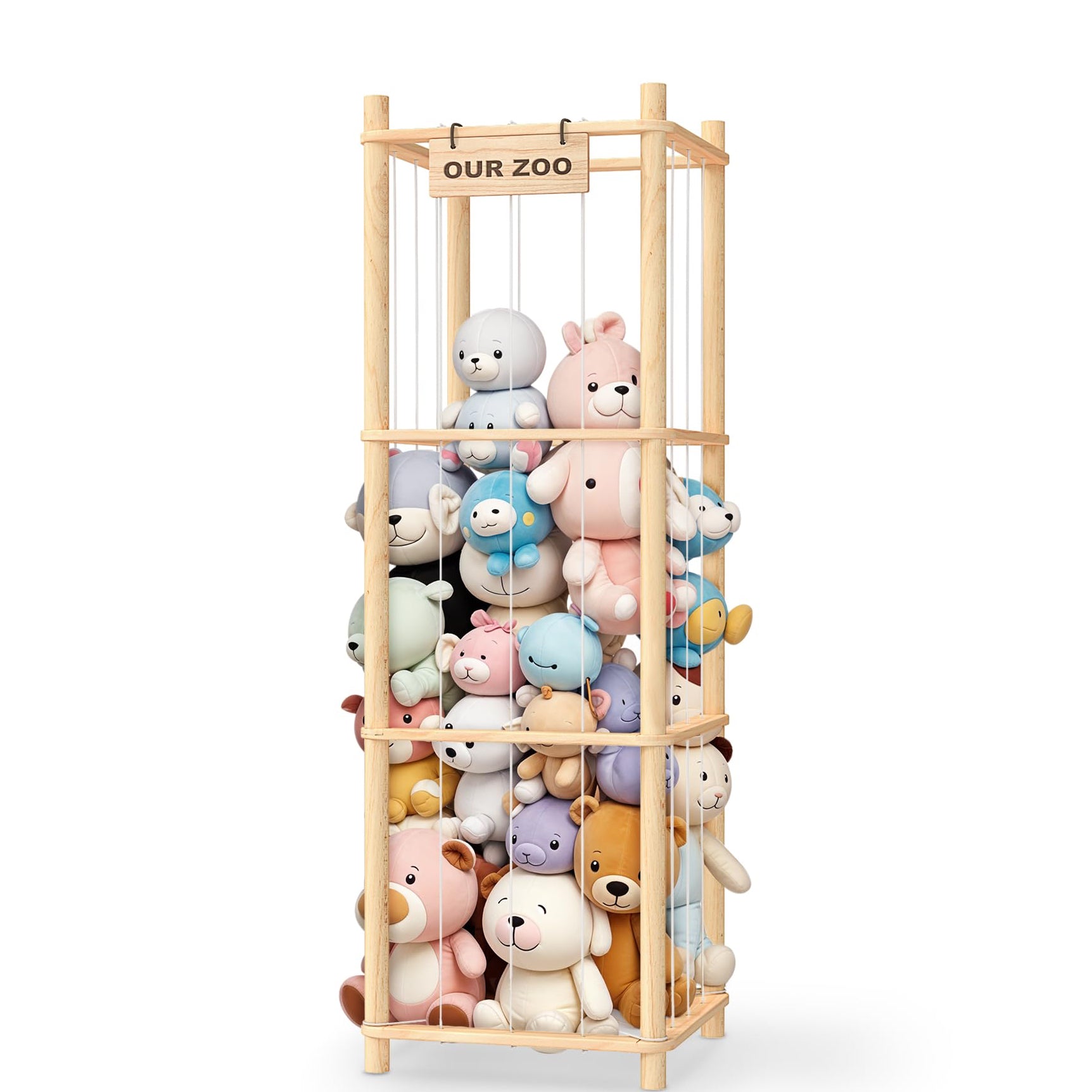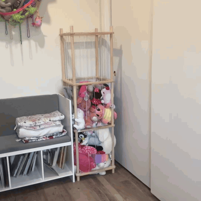 No more digging through piles. The open, columnar frame and clear elastic cords let you spot each toy instantly. Even plushies buried at the bottom pop right out through those stretchy gaps.